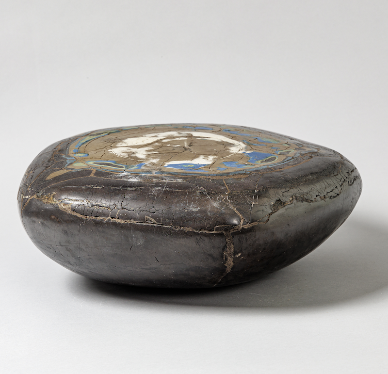 Grès noir modelé puis, en terres humides sur terre sèche, recouvert de différents grès colorés. Cuisson 1250° en four électrique. Après cuisson : décapage de surface -érosion-, puis long polissage abrasif pour obtenir la brillance. Amalgame en bronze (45X45X16 cm).Céramique disponible.